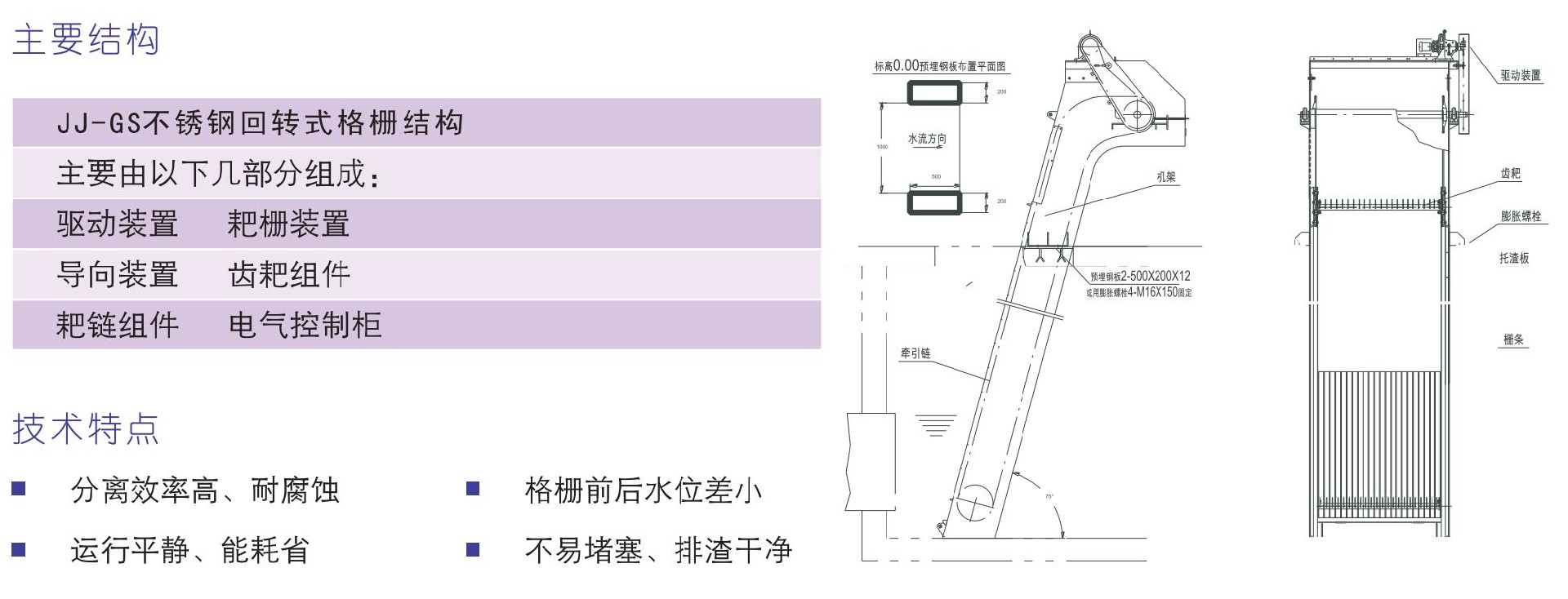 其特点有:分离效率高、耐腐蚀;格栅前后水位差小;运行平静、能耗省;不易堵塞、排渣干净。